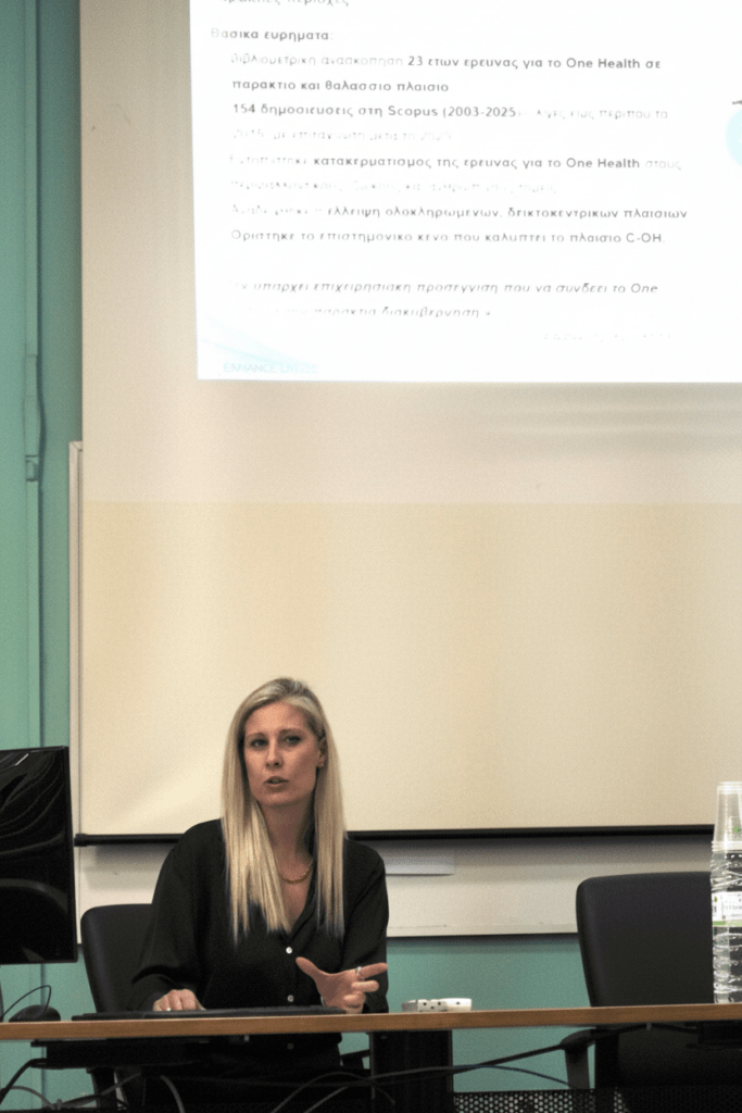 Researchers from the project team then presented key scientific aspects of ENHANCE. Dr. Alexandra Ioannou introduced the project’s One Health framework for coastal risk assessment, Dr. Evmorfia Bataka explained the sampling protocol linking satellite and field data, and Nikolaos Kokosis, PhD candidate at the University of Thessaly, presented approaches for risk quantification in coastal environments.
